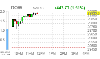 Основные фондовые индексы США повышаются, так как надежды на быстрое восстановление экономики после спада, вызванного пандемией, усилились после оглашения положительных результатов испытаний вакцины против COVID-19 компанией Moderna (MRNA).