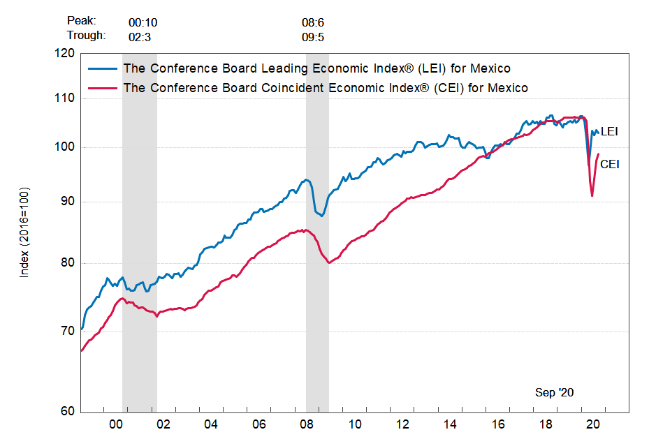 Результаты исследований, опубликованные Conference Board, показали: по итогам сентября ведущий экономический индекс (LEI) для Мексики упал на 0,5 процента, и составил 103,0 пункта (2016=100). Напомним, индекс зафиксировал повышение на 1,0 процента в августе и падение на 0,8 процента в июле. В течение шести месяцев (с марта по сентябрь 2020 года) показатель вырос на 1,3 процента после снижения на 1,7 процента за предыдущий шестимесячный период (с февраля по август 2020 года).