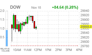 Большинство компонентов DOW в плюсе (16 из 30). Лидер роста - Dow Inc. (DOW; +2.97%). Аутсайдер - Walgreens Boots Alliance (WBA; -2.06%).