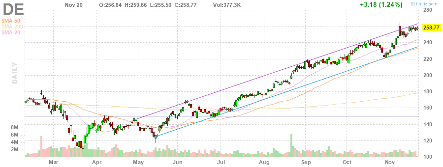 На текущий момент акции DE котируются по $258.77 (+1.25%).