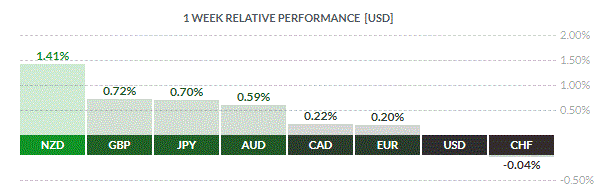 По итогам недели почти все основные валюты продемонстрировали снижение. Наибольший прирост по отношению к доллару США показал новозеландский доллар (+1,41%). Меньшее повышение зафиксировали фунт (+0,72%), японская иена (+0,70%), австралийский доллар (+0,59%), канадский доллар (+0,22%) и евро (+0,20%). Снизился только швейцарский франк (-0,04%).