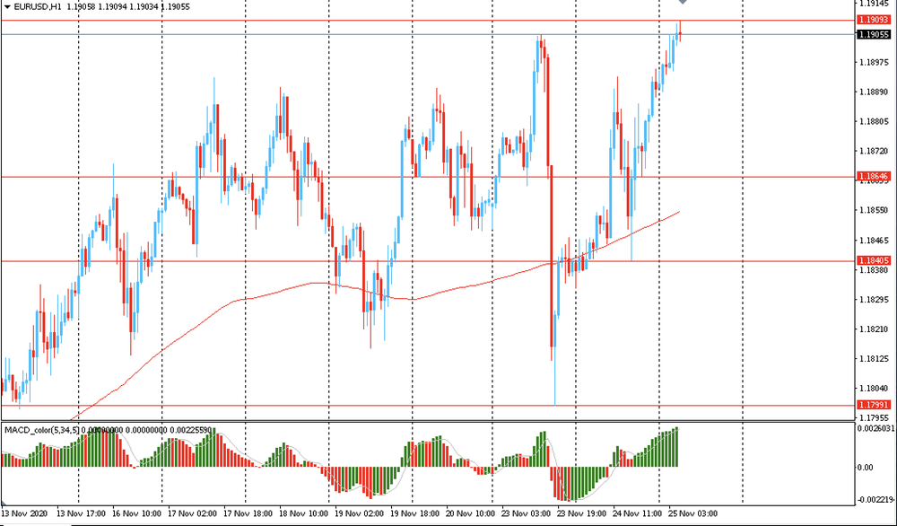 Вчера пара EUR/USD торговалась с повышением и закрыла день на положительной территории около цены $1.1890. Сегодня пара также немного выросла, поднявшись к отметке $1.1910. На часовом графике EUR/USD все еще торгуется выше линии скользящей средней МА (200) Н1 ($1.1855). На четырехчасовом графике ситуация аналогичная. Исходя из вышесказанного, вероятно, стоит придерживаться северного направления в торговле и пока пара остается выше MA 200 H1, необходимо искать точки входа на покупку на формирование коррекции.