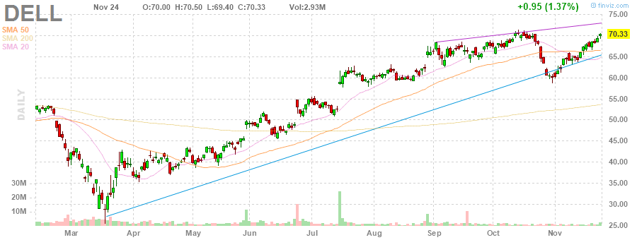 Акции DELL на премаркете выросли до уровня $70.95 (+0.88%).