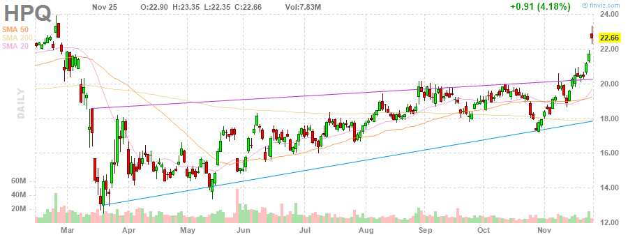 В HP также сообщили, что в первом квартале 2021 ФГ рассчитывают получить скорректированную прибыли в размере $0.64-0.70 на акцию, что оказалось намного выше консенсус-прогноза Уолл-стрит в $0.54 на акцию. В то же время компания не дала прогнозов по продажам, но сообщила, что планирует увеличить дивиденды на 10% в 2021 ФГ.