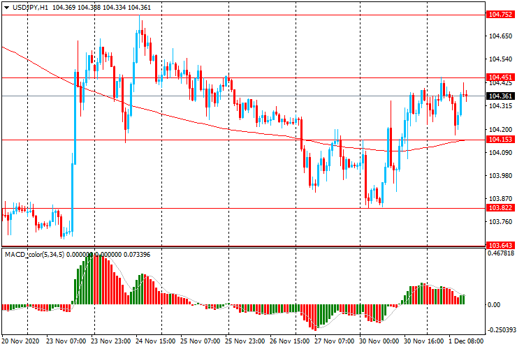 USD/JPY: пара торгуется в диапазоне Y104.15-45 - немного выше линии скользящей средней МА (200) Н1 (Y104.15).