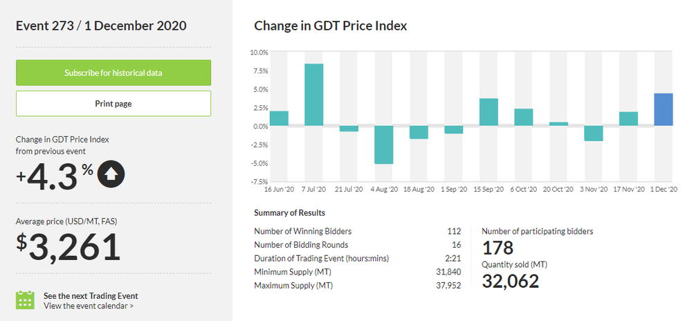 Как стало известно, стоимость молочной продукции увеличилась на 4,3%, до $3 261 за метрическую тонну после того, как выросла на 1,8% в ходе предыдущего аукциона. Результаты аукциона также показали, что стоимость цельного сухого молока увеличилась на 5,0%, составив $3 182 за метрическую тонну после того, как выросла на 1,8% в ходе предыдущего аукциона. Тем временем, цена обезжиренного сухого молока выросла на 3,6%, до $2 889 за метрическую тонну после того, как выросла на 2,5% в ходе предыдущего аукциона.