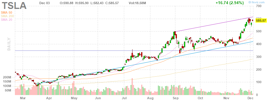 Инвесторы могут ожидать более значительного движения акций в ближайшие недели. Акции Tesla будут включены в S&P 500 21 декабря. Рынки опционов предполагают, что акции Tesla вырастут/упадут примерно на 23% в следующие несколько недель. Сравнимый расчет для акций General Motors (GM), например, предсказывает колебания на 10% или 11%.