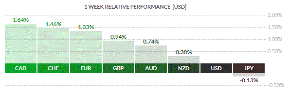 По итогам недели почти все основные валюты продемонстрировали повышение. Наибольший прирост по отношению к доллару США показал канадский доллар (+1,64%). Меньшее повышение зафиксировали швейцарский франк (+1,46%), евро (+1,33%), британский фунт (+0,94%), австралийский доллар (+0,74%) и новозеландский доллар (+0,30%). Снизилась только японская иена (-0,13%).