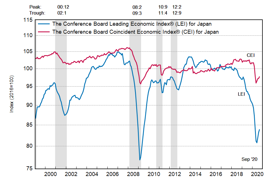 Результаты исследований, опубликованные Conference Board, показали: по итогам сентября ведущий экономический индекс (LEI) для Японии вырос на 0,8 процента, и составил 83,9 пункта (2016=100). Напомним, индекс зафиксировал повышение на 1,6 процента в августе и увеличение на 1,4 процента в июле. В течение шести месяцев (с марта по сентябрь 2020 года) показатель упал на 3,9 процента после снижения на 6,8 процента за предыдущий шестимесячный период (с февраля по август 2020 года).