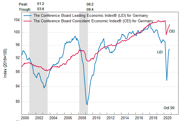 Результаты исследований, опубликованные Conference Board, показали: по итогам октября ведущий экономический индекс (LEI) для Германии вырос на 0,1 процента, и составил 94,7 пункта (2016=100). Напомним, индекс зафиксировал повышение на 0,6 процента в сентябре и увеличение на 3,0 процента в августе. В течение шести месяцев (с апреля по октябрь 2020 года) показатель вырос на 6,4 процента после увеличения на 1,3 процента за предыдущий шестимесячный период (с марта по сентябрь 2020 года).