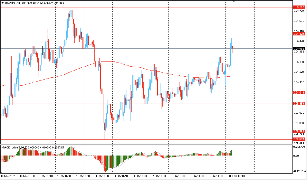 Вчера пара USD/JPY торговалась с повышением и закрыла день на положительной территории около цены Y104.20. Сегодня пара также выросла, поднявшись к отметке Y104.45. На часовом графике USD/JPY тестирует на прочность сопротивление - линию скользящей средней МА (200) Н1 (Y104.20). На четырехчасовом графике ситуация аналогичная. Исходя из вышесказанного, вероятно, стоит придерживаться южного направления в торговле и пока пара окончательно не закрепится выше MA 200 H1, необходимо искать точки входа на продажу на окончание коррекции.