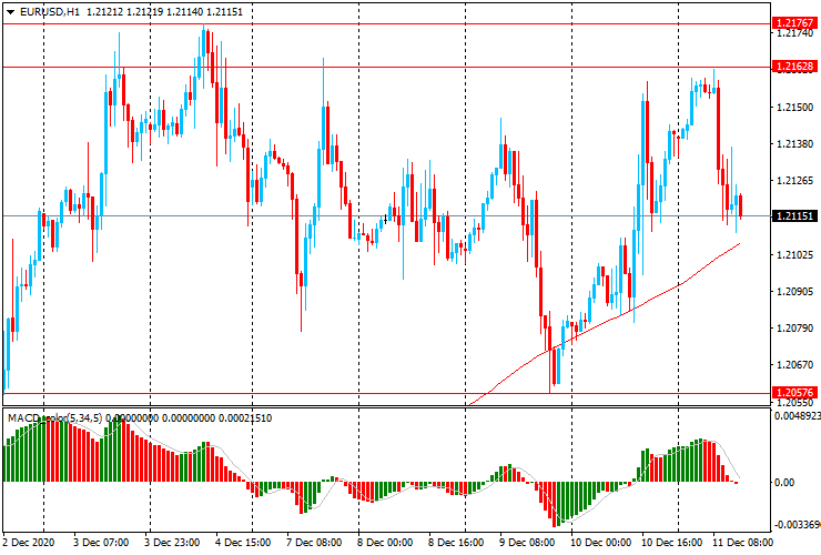 ЕUR/USD: в ходе европейских торгов пара снизилась с $1.2160 к $1.2110, но остается выше линии скользящей средней MA (200) H1 ($1.2105).