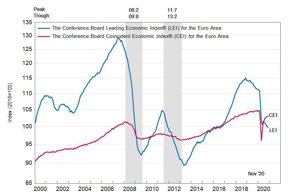 Результаты исследований, опубликованные Conference Board, показали: по итогам ноября ведущий экономический индекс (LEI) для еврозоны упал на 0,3 процента, и составил 99,8 пункта (2016=100). Напомним, индекс зафиксировал снижение на 0,6 процента в октябре и падение на 0,3 процента в сентябре. В течение шести месяцев (с мая по ноябрь 2020 года) показатель снизился на 0,8 процента после снижения на 1,4 процента за предыдущий шестимесячный период (с апреля по октябрь 2020 года).