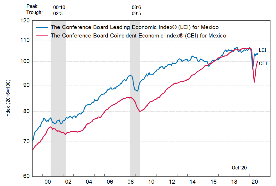 Результаты исследований, опубликованные Conference Board, показали: по итогам октября ведущий экономический индекс (LEI) для Мексики вырос на 0,6 процента, и составил 103,7 пункта (2016=100). Напомним, индекс зафиксировал снижение на 0,5 процента в сентябре и увеличение на 1,1 процента в августе. В течение шести месяцев (с апреля по октябрь 2020 года) показатель вырос на 7,2 процента после повышения на 1,4 процента за предыдущий шестимесячный период (с марта по сентябрь 2020 года).