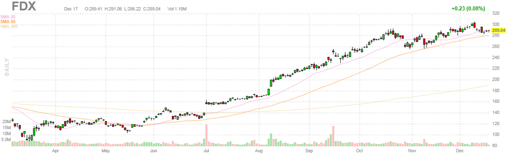 На текущий момент акции FDX котируются по $289.04 (+0.08%).