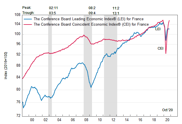 Результаты исследований, опубликованные Conference Board, показали: по итогам октября ведущий экономический индекс (LEI) для Франции не изменился, и составил 102,2 пункта (2016=100). Напомним, индекс зафиксировал нулевое изменение в сентябре и снижение на 0,1 процента в августе. В течение шести месяцев (с апреля по октябрь 2020 года) показатель вырос на 4,7 процента после повышения на 1,3 процента за предыдущий шестимесячный период (с марта по сентябрь 2020 года).