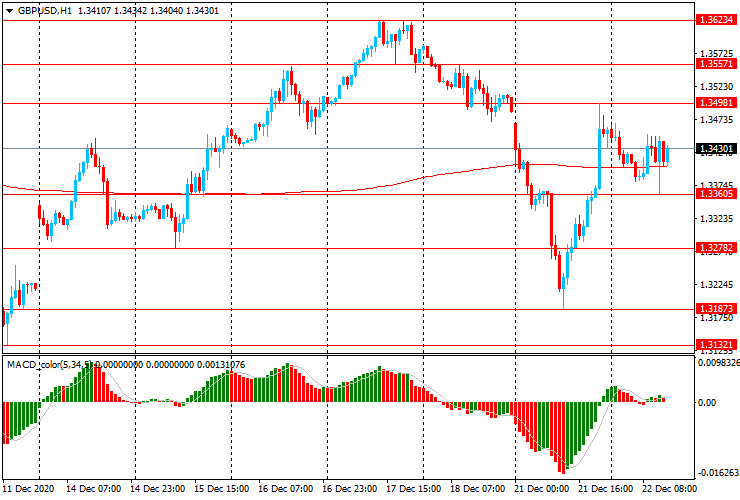 GBP/USD: пара торгуется в диапазоне $1.3360-$1.3470, немного ниже уровня закрытия вчерашней сессии ($1.3500).