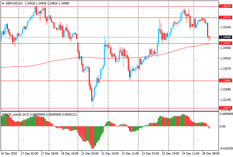 GBP/USD: пара торгуется в основном со снижением с $1.3575 до $1.3474 и может попытаться протестировать на прочность поддержку МА (200) Н1 ($1.3465).