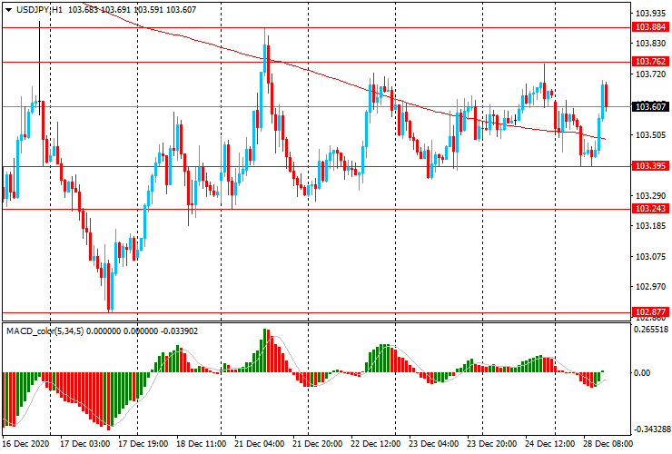 USD/JPY: пара торгуется в диапазоне Y103.40-70 и тестирует линию скользящей средней МА (200) Н1 (Y103,50).