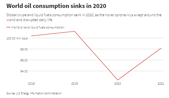 По данным EIA, потребление сырой нефти и жидкого топлива в мире упало до 92,4 млн баррелей в сутки за год, что на 9% ниже 101,2 млн баррелей в сутки в 2019 году.
