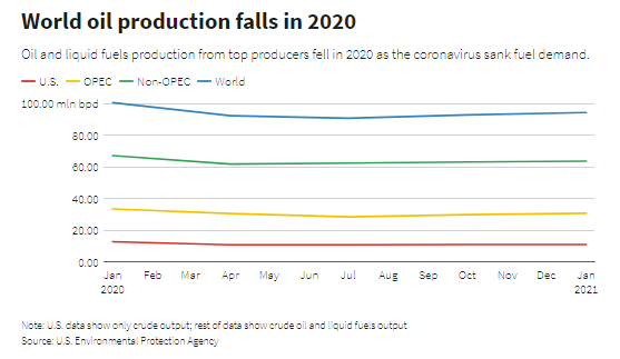 Мировое производство нефти и жидкого топлива упало в 2020 году до 94,25 миллиона баррелей в сутки с 100,61 миллиона баррелей в сутки в 2019 году, а в следующем году ожидается восстановление добычи только до 97,42 миллиона баррелей в сутки, сообщает Управление энергетической информации.