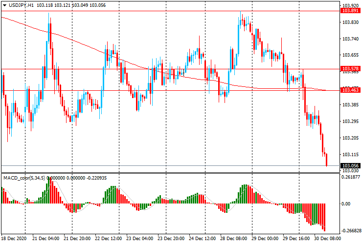 USD/JPY: пара торгуется со снижением с Y103.60 до Y103.05, опустившись ниже линии скользящей средней МА (200) Н1 (Y103,45).