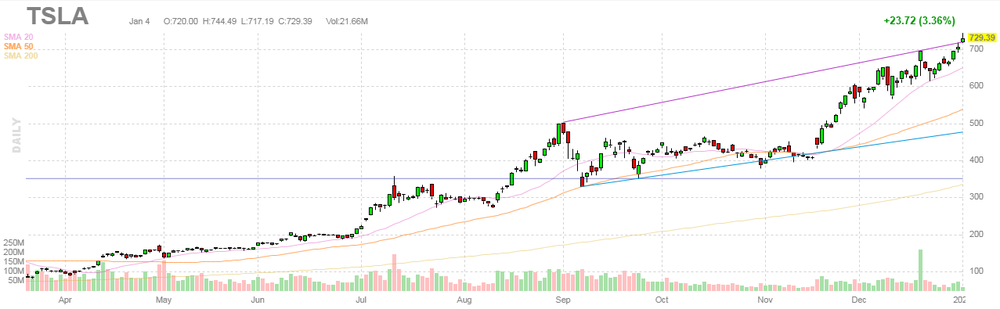 На текущий момент акции TSLA котируются по $729.39 (+3.36%).