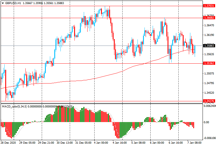 GBP/USD: пара торгуется в основном со снижением в диапазоне $1.3555-1.3630 и тестирует линию скользящей средней МА (200) Н1 ($1.3585).