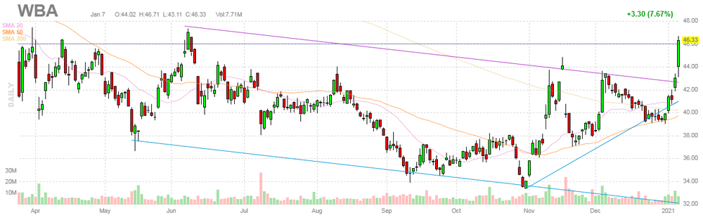 На текущий момент акции WBA котируются по $46.33 (+7.67%).