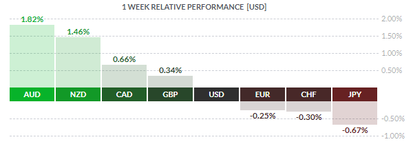По итогам недели большинство основных валют продемонстрировали повышение. Прирост по отношению к доллару США показали австралийский доллар (+1,82%), новозеландский доллар (+1,46%), канадский доллар (+0,66%) и британский фунт (+0,34%). Падение зафиксировали японская иена (-0,67%), швейцарский франк (-0,30%) и евро (-0,25%).
