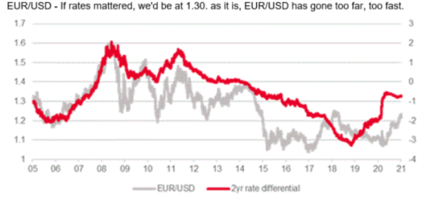 "График немного ретроспективен, показывает разницу между краткосрочными ставками и EUR/USD. В прежние времена текущий спред ставок соответствовал бы курсу EUR/USD около 1,30. Сегодня все, что мы можем сказать, это то, что относительные ставки больше не движутся в пользу евро, а пара EUR/USD сильно выросла на фоне наращивания позиций, которые необходимо сокращать",-отмечает SocGen.