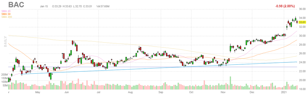 Согласно обнародованному отчету, прибыль компании Bank of America (BAC) по итогам четвертого квартала 2020 финансового года (ФГ) достигла $0.59 в расчете на одну акцию (против $0.74 на одну акцию в четвертом квартале 2019 ФГ), что оказалось выше среднего прогноза аналитиков на уровне $0.54 на одну акцию.