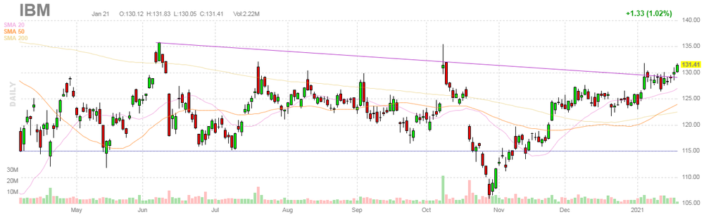 На текущий момент акции IBM котируются по $131.41 (+1.02%).