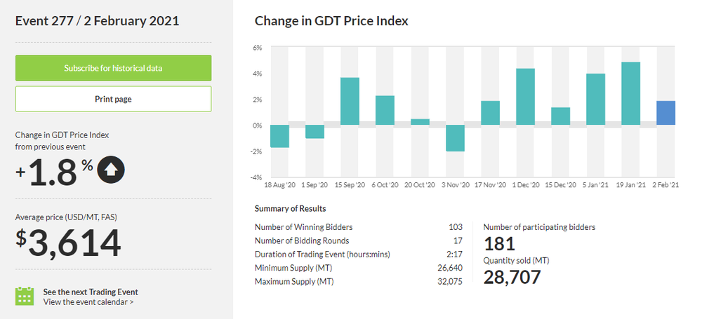 Как стало известно, стоимость молочной продукции увеличилась на 1,8%, до $3 614 за метрическую тонну после того, как выросла на 4,8% в ходе предыдущего аукциона. Результаты аукциона также показали, что стоимость цельного сухого молока увеличилась на 2,3%, составив $3 458 за метрическую тонну после того, как выросла на 2,2% в ходе предыдущего аукциона. Тем временем, цена обезжиренного сухого молока упала на 1,5%, до $3 198 за метрическую тонну после того, как поднялась на 7,0% в ходе предыдущего аукциона.