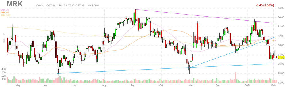 Согласно обнародованному отчету, прибыль компании Merck (MRK) по итогам четвертого квартала 2020 финансового года (ФГ) достигла $1.32 в расчете на одну акцию (против $1.16 на одну акцию в четвертом квартале 2019 ФГ), что оказалось ниже среднего прогноза аналитиков на уровне $1.39 на одну акцию.