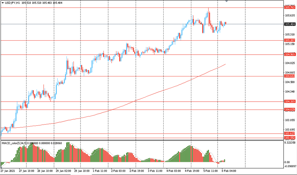 В пятницу пара USD/JPY торговалась разнонаправлено в диапазоне Y105.35-75 и закрыла день без существенных изменений. Сегодня пара также торговалась в узком диапазоне Y105.35-55, оставаясь вблизи максимума октября 2020. На часовом графике USD/JPY все еще торгуется выше линии скользящей средней МА (200) Н1 (Y104.80). На четырехчасовом графике ситуация аналогичная. Исходя из вышесказанного, вероятно, стоит придерживаться северного направления в торговле и пока пара остается выше MA 200 H1, необходимо искать точки входа на покупку на формирование коррекции.