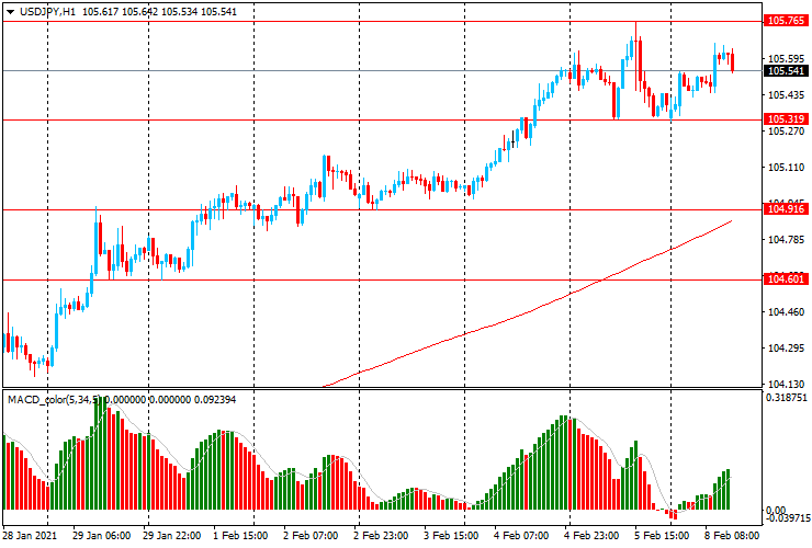 USD/JPY: пара торгуется в основном с ростом и остается в рамках пятничного торгового диапазона Y105.30-75 - около десятинедельного максимума.