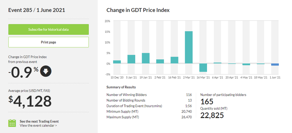 Как стало известно, стоимость молочной продукции снизилась на 0,9%, до $4 128 за метрическую тонну после того, как упала на 0,2% в ходе предыдущего аукциона. Результаты аукциона также показали, что стоимость цельного сухого молока упала на 0,5%, составив $4 062 за метрическую тонну после того, как уменьшилась на 0,2% в ходе предыдущего аукциона. Тем временем, цена обезжиренного сухого молока снизилась на 0,5%, и составила $3 415 за метрическую тонну после того, как выросла на 0,7% в ходе предыдущего аукциона.