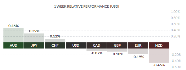 По итогам недели большинство основных валют продемонстрировали снижение. Наибольший спад по отношению к доллару США показал новозеландский доллар (-0,46%). Меньшее падение зафиксировали евро (-0,19%), британский фунт (-0,10%) и канадский доллар (-0,07%). Повышение показали австралийский доллар (+0,46%), японская иена (+0,29%) и швейцарский франк (+0,12%).