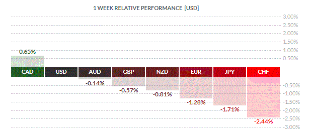 По итогам недели почти все основные валюты продемонстрировали снижение. Наибольший спад по отношению к доллару США показал швейцарский франк (-2,44%). Меньшее падение зафиксировали японская иена (-1,71%), евро (-1,28%), новозеландский доллар (-0,81%), британский фунт (-0,57%) и австралийский доллар (-0,14%). Вырос только канадский доллар (+0,65%).