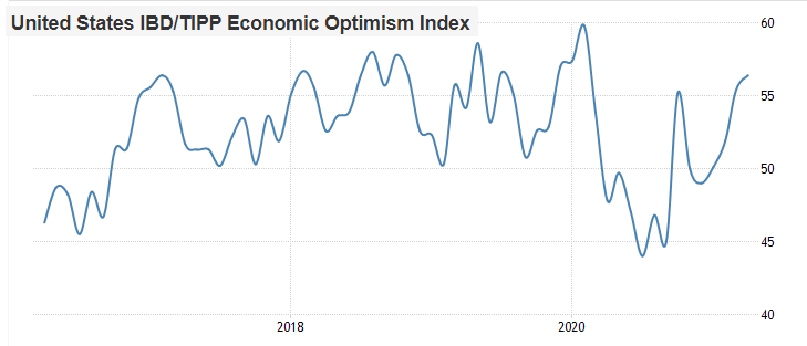 Данные показали, что индекс экономического оптимизма в США, рассчитываемый газетой Investor's Business Daily и исследовательской фирмой TechnoMetrica Institute of Policy and Politics, вырос в начале апреля, и достиг нового максимума эпохи Covid, чему способствовала кампания вакцинации и очередные меры стимулирования.