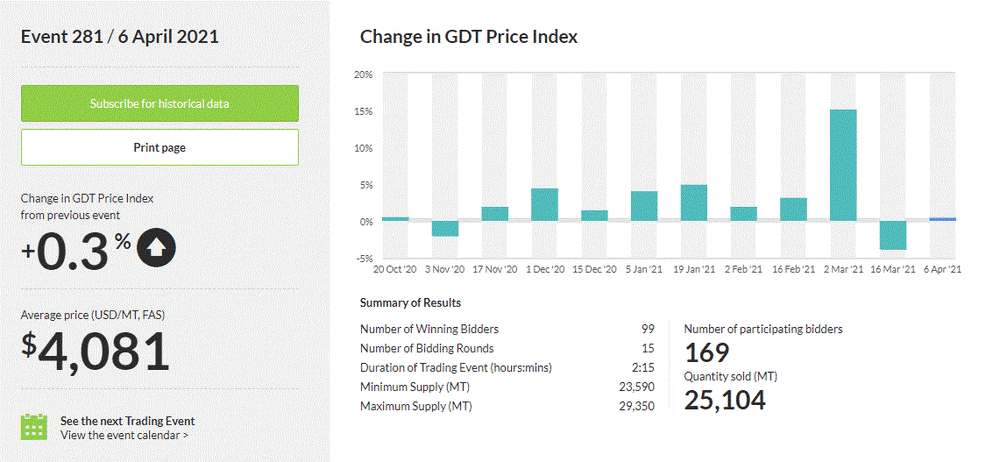 Как стало известно, стоимость молочной продукции выросла на 0,3%, до $4 081 за метрическую тонну после того, как упала на 3,8% в ходе предыдущего аукциона. Результаты аукциона также показали, что стоимость цельного сухого молока не изменилась, составив $4 085 за метрическую тонну после того, как снизилась на 6,2% в ходе предыдущего аукциона. Тем временем, цена обезжиренного сухого молока поднялась на 0,6%, до $3 367 за метрическую тонну после того, как выросла на 0,7% в ходе предыдущего аукциона.