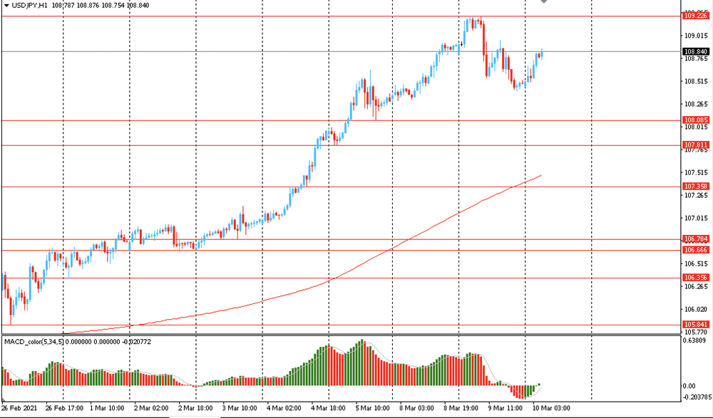 Вчера пара USD/JPY торговалась с понижением и закрыла день в красной зоне около цены Y108.50. Сегодня пара торговалась в узком диапазоне Y108.45-85, оставаясь вблизи вчерашней цены закрытия. На часовом графике USD/JPY все еще торгуется выше линии скользящей средней МА (200) Н1 (Y107.45). На четырехчасовом графике ситуация аналогичная. Исходя из вышесказанного, вероятно, стоит придерживаться северного направления в торговле и пока пара остается выше MA 200 H1, необходимо искать точки входа на покупку на формирование коррекции.