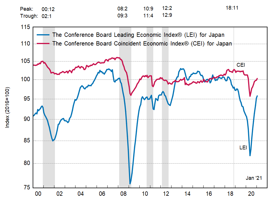Результаты исследований, опубликованные Conference Board, показали: по итогам января ведущий экономический индекс (LEI) для Японии вырос на 0,6 процента, и составил 95,8 пункта (2016=100).