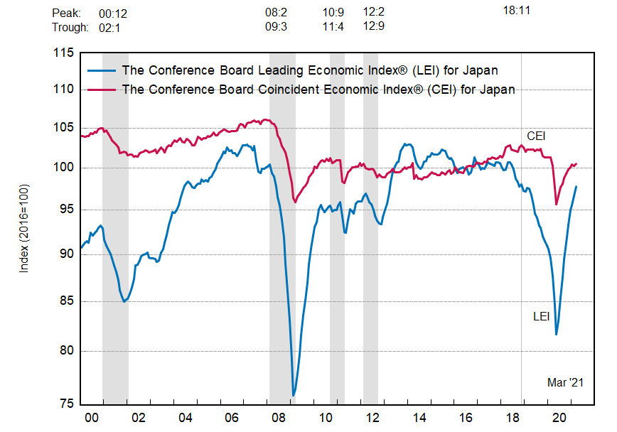 Результаты исследований, опубликованные Conference Board, показали: по итогам марта ведущий экономический индекс (LEI) для Японии вырос на 1,1 процента, и составил 97,8 пункта (2016=100).