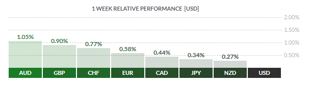 По итогам недели все основные валюты продемонстрировали повышение. Наибольший прирост по отношению к доллару США показал австралийский доллар (+1,05%). Меньшее повышение зафиксировали британский фунт (+0,90%), швейцарский франк (+0,77%), евро (+0,58%), канадский доллар (+0,44%), японская иена (+0,34%) и новозеландский доллар (+0,27%).
