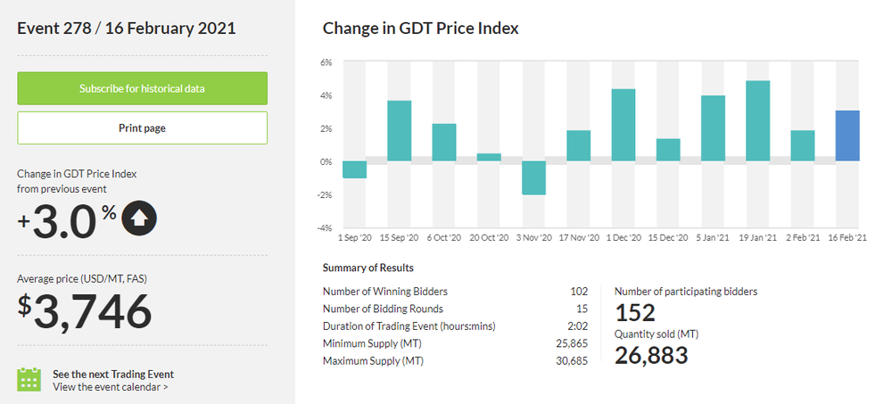 Как стало известно, стоимость молочной продукции увеличилась на 3,0%, до $3 746 за метрическую тонну после того, как выросла на 1,8% в ходе предыдущего аукциона. Результаты аукциона также показали, что стоимость цельного сухого молока увеличилась на 4,3%, составив $3 615 за метрическую тонну после того, как выросла на 2,3% в ходе предыдущего аукциона. Тем временем, цена обезжиренного сухого молока поднялась на 0,3%, до $3 207 за метрическую тонну после того, как упала на 1,5% в ходе предыдущего аукциона.
