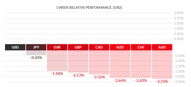 По итогам недели все основные валюты продемонстрировали снижение. Наибольший спад по отношению к доллару США показал австралийский доллар (-2,72%). Меньшее падение зафиксировали швейцарский франк (-2,65%), новозеландский доллар (-2,64%), канадский доллар (-2,32%), британский фунт (-2,13%), евро (-1,98%) и японская иена (-0,45%).