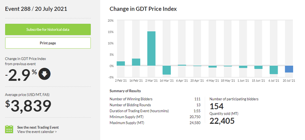 Как стало известно, стоимость молочной продукции снизилась на 2,9%, до $3 839 за метрическую тонну после того, как упала на 3,6% в ходе предыдущего аукциона. Результаты аукциона также показали, что стоимость цельного сухого молока упала на 3,8%, составив $3 730 за метрическую тонну после того, как уменьшилась на 3,0% в ходе предыдущего аукциона. Тем временем, цена обезжиренного сухого молока упала на 5,2%, и составила $2 971 за метрическую тонну после того, как обвалилась на 7,0% в ходе предыдущего аукциона.