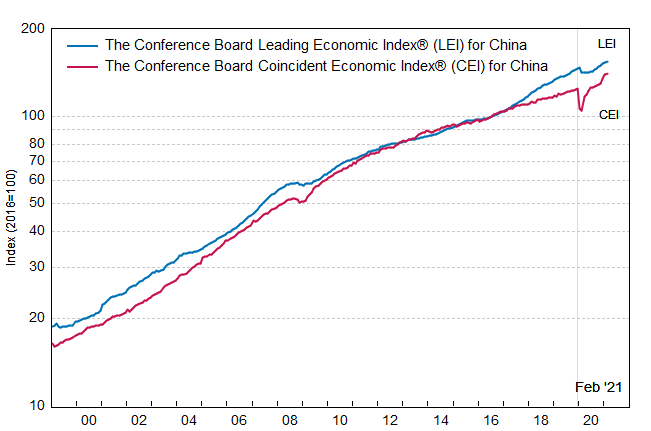 Результаты исследований, опубликованные Conference Board, показали: по итогам февраля ведущий экономический индекс (LEI) для Китая вырос на 1,1 процента, и составил 154,8 пункта (2016=100).